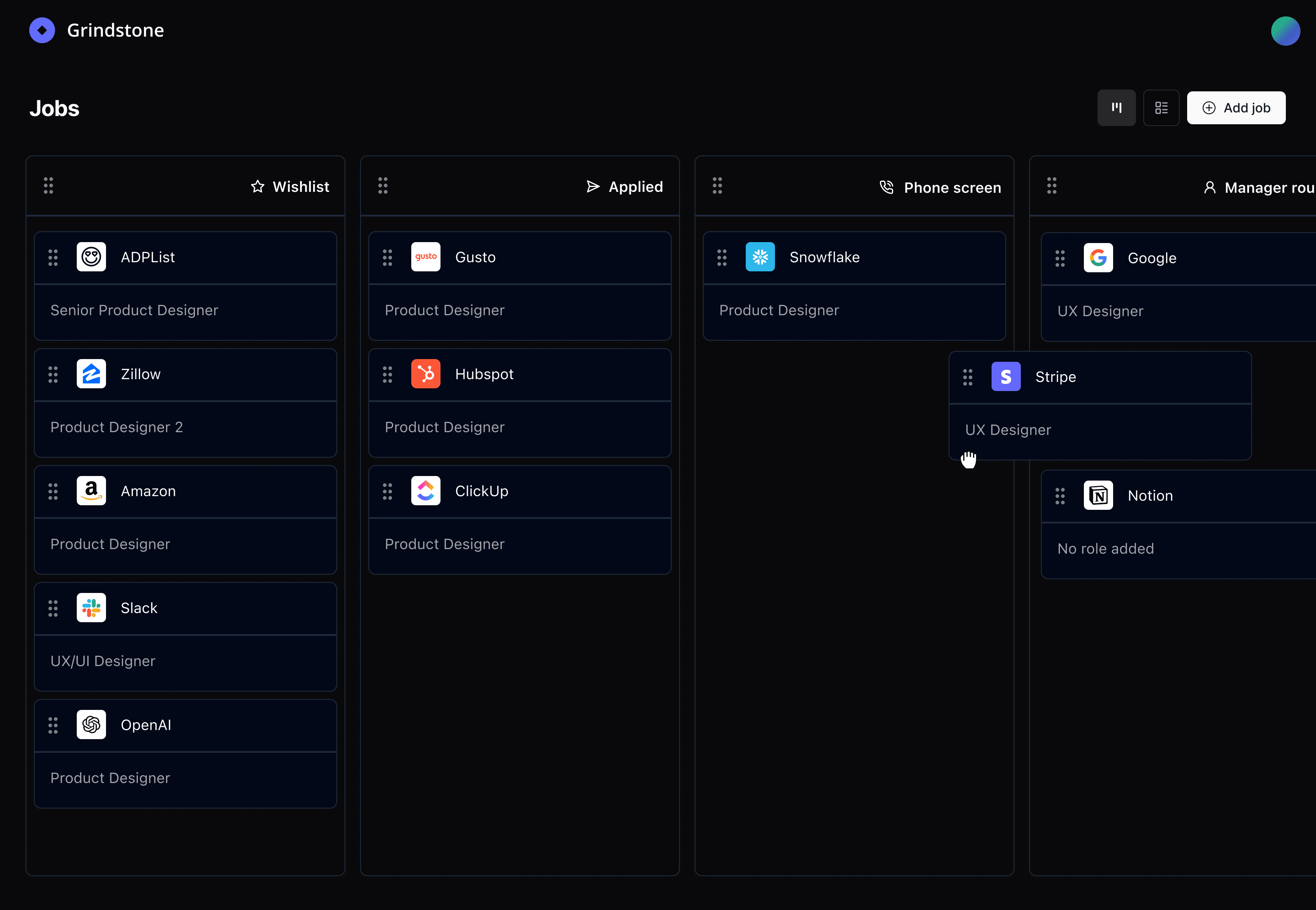 Grindstone is a job application tracker, that helps you get organized, find the right postings and land your next gig